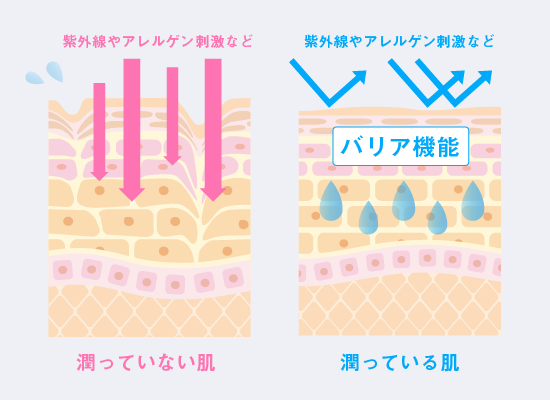 また、肌が充分に潤っている場合、皮膚のバリア機能も効果的に働くため、肌トラブルの予防にもつながります。