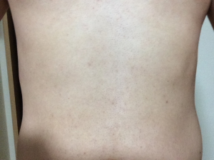 今回は胸・腹の3回目の施術を行いました。前回が今年の1月だったので、約3ヶ月ぶりと久しぶりの施術でした。 前回施術後は1週間くらいしたあたりから、ポロポロと抜け始めてきて、よしよし!という感じでした。 時間が経つと少しず